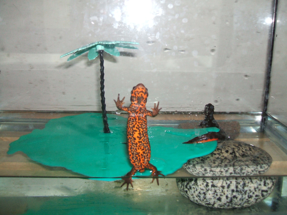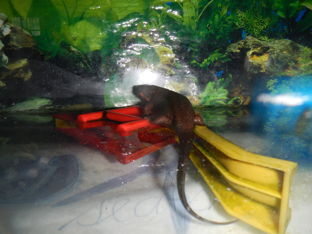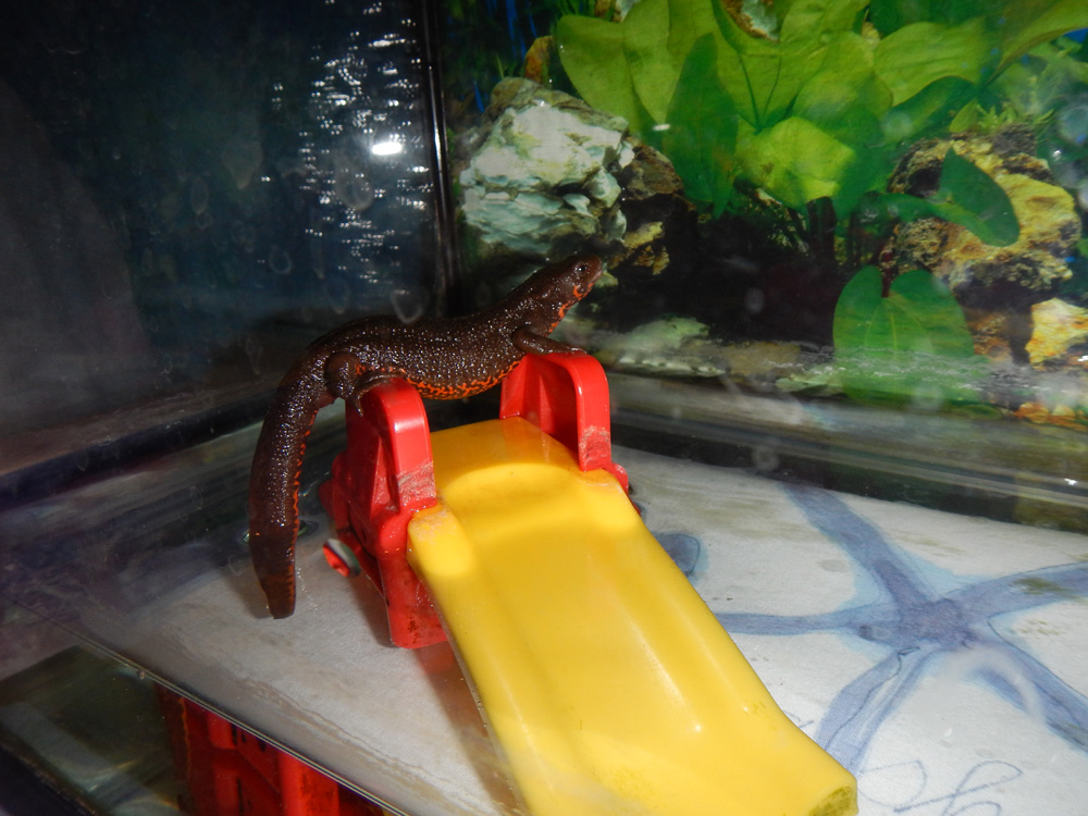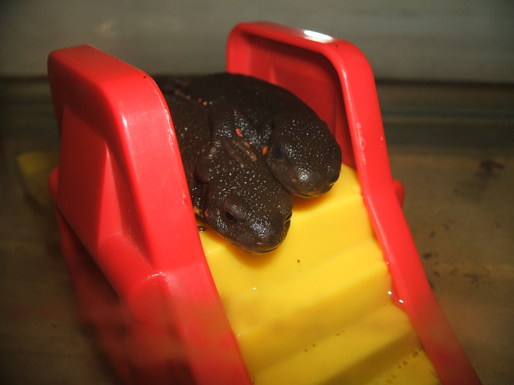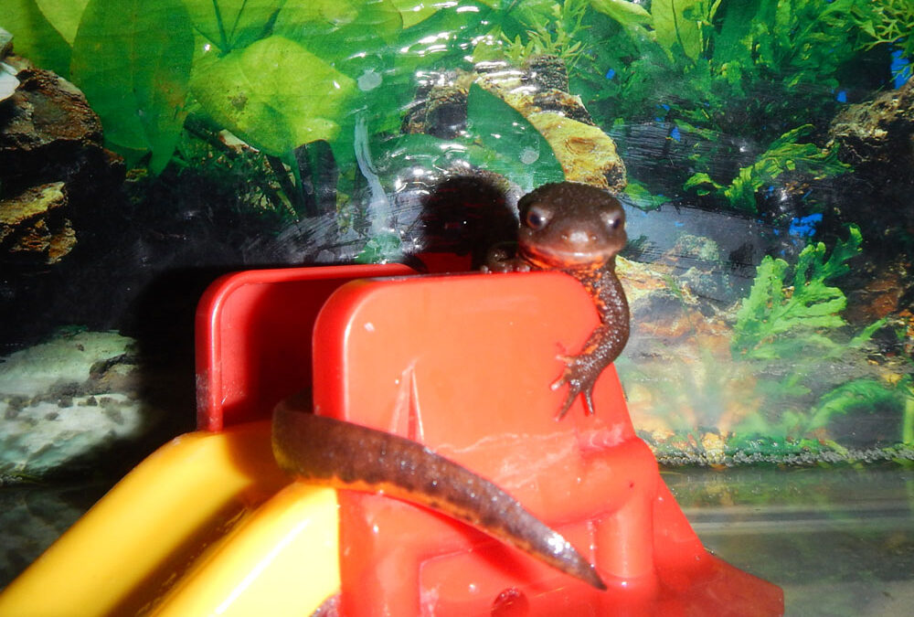 Japanese Fire Belly Newts are known for their social behavior. They often live in groups and exhibit a unique courtship display that involves a dance-like interaction between males and females. My second newt didn’t live as long, however my remaining one seems to enjoy the company of humans as well. He often comes up to the glass to greet people, and will sometime become very active, appearing to be showing off!